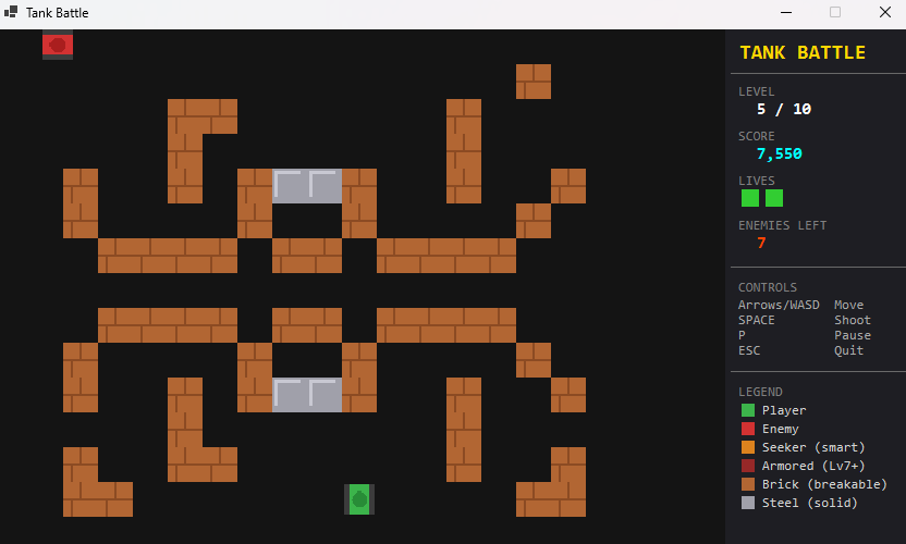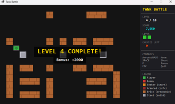 - Destructible brick walls; indestructible steel walls
